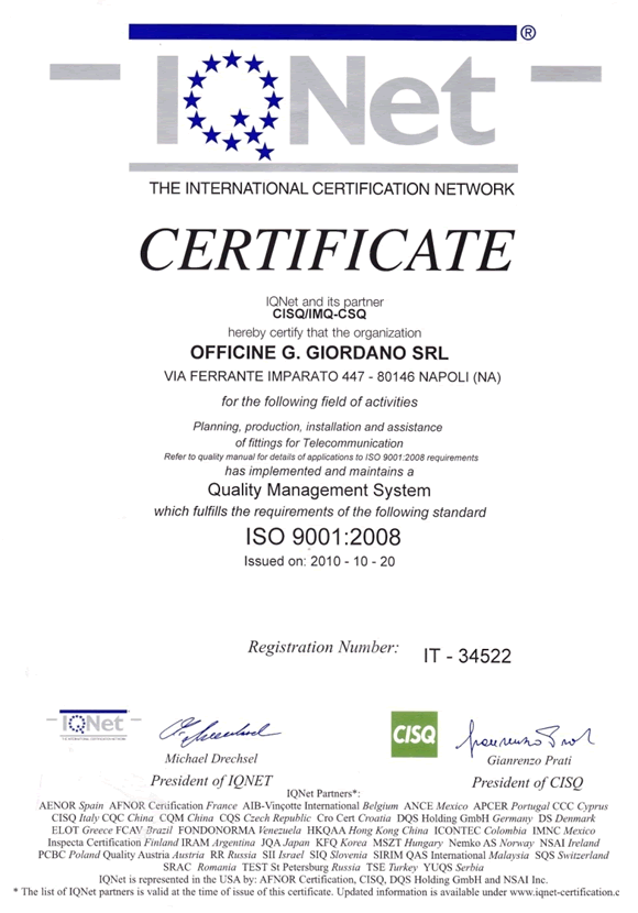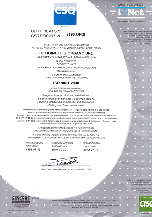 è in possesso della certificazione Iso 9001, attestazione SOA e certificazione di sicurezza NOS poiché le attività sono estese anche nel campo militare.